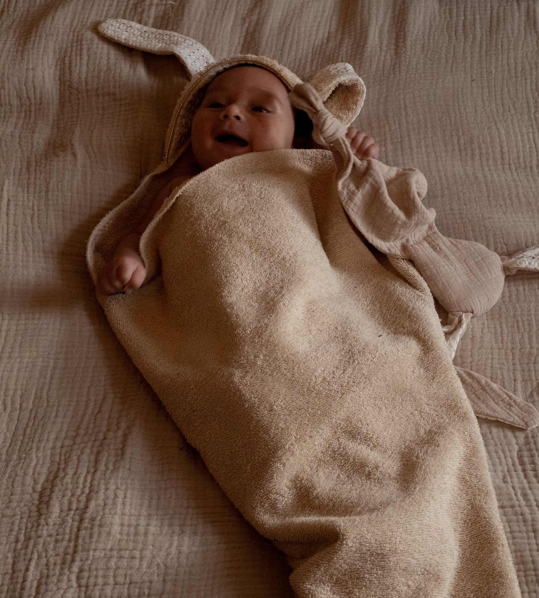 Omhul uw kindje met de Badcape Knyn, de ultieme luxe badcape die niet alleen warmte biedt, maar ook een speelse uitstraling heeft! Of het nu gaat om na het bad of een plezierige zwemervaring, deze badcape brengt stijl en comfort samen. Met schattige konijnenoren op de capuchon verandert elke badtijd in een magische ervaring. Geef uw kleintje de liefdevolle verzorging die het verdient, terwijl u geniet van de kwaliteit en het ontwerp van deze unieke badcape.